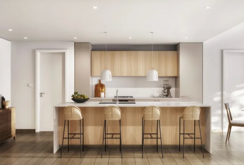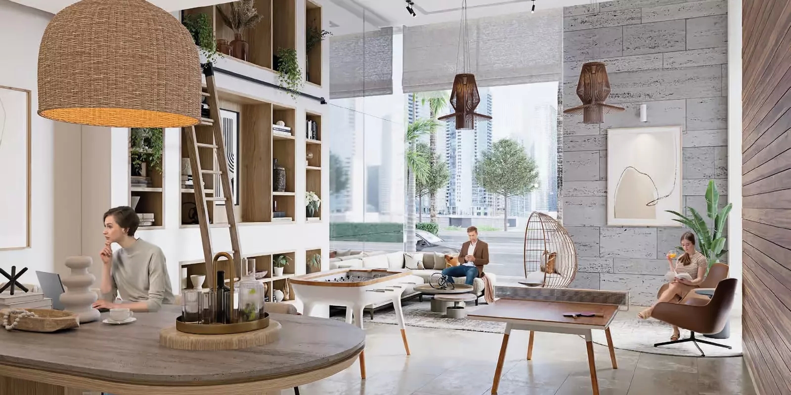 An elegant tower with a contemporary style façade and a contrasting palette of white and timber. The entrance of the building is highlighted by the rich and textural dark travertine and grand lobby windows providing a peek into the art and living experience that lies within. The Portman is a modern perspective on vibrant urban living with peaceful and bright vibes. With its beach connotations, the light palette provides a neutral and reassuring environment to the residents’ active lives. The color scheme is a mix of bright white, neutral coffee tones, and warm wood accented with delicate touches of black, textural compositions, and art.